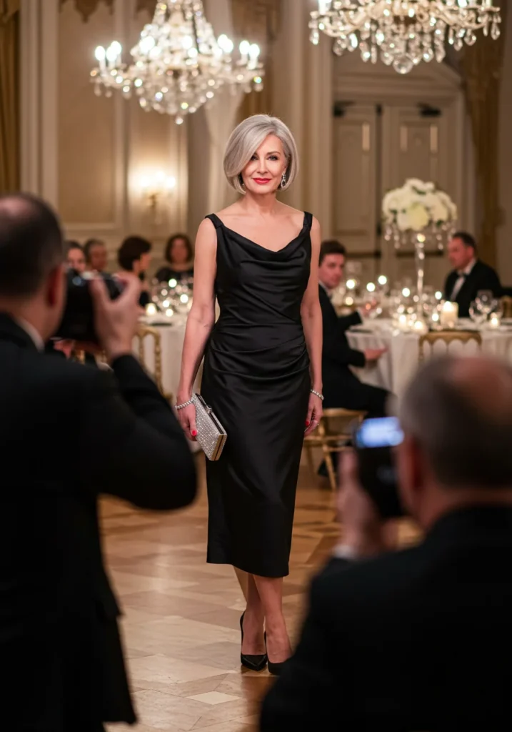 A classic black satin dress provides a sleek, figure-flattering silhouette. The flowing fabric skims your body, creating a chic look without being too tight. Paired with black pumps and a silver clutch, this outfit is perfect for formal dinners or evening galas. [Vogue calls it “effortlessly chic.”]