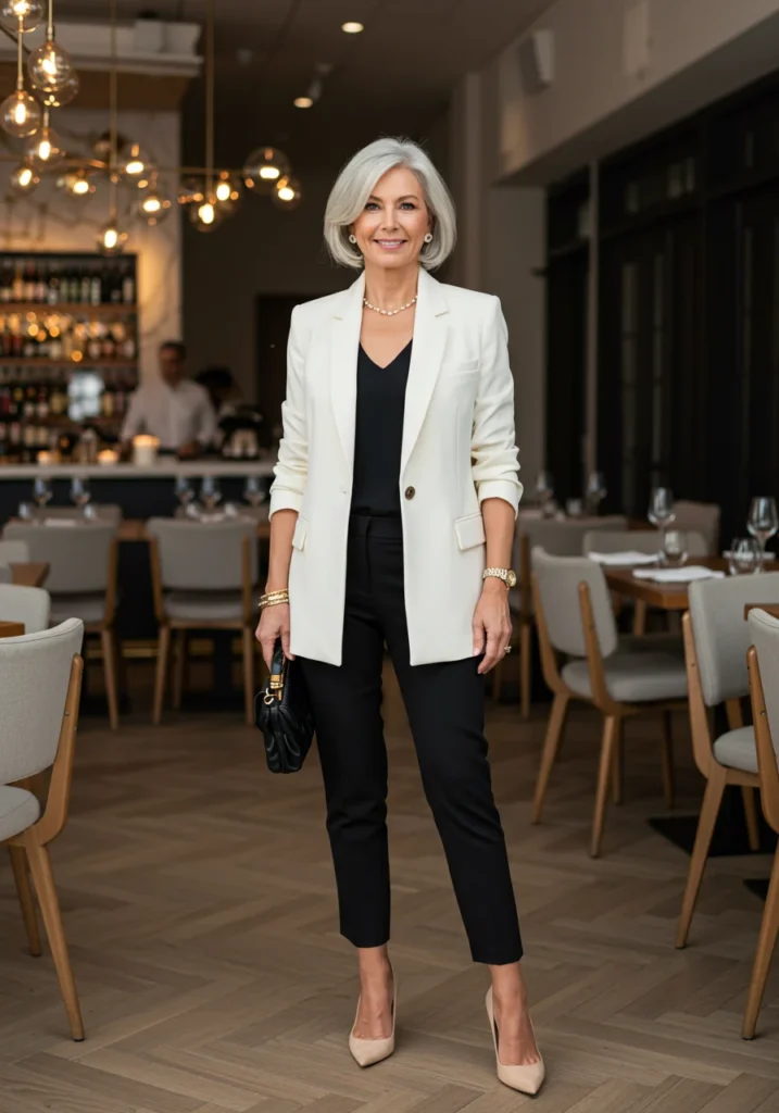 A well-tailored white blazer paired with black trousers is a polished look that works for both work and dinner events. The trousers elongate the legs, while the blazer adds structure to the upper body. Nude pumps keep the look streamlined and sophisticated.