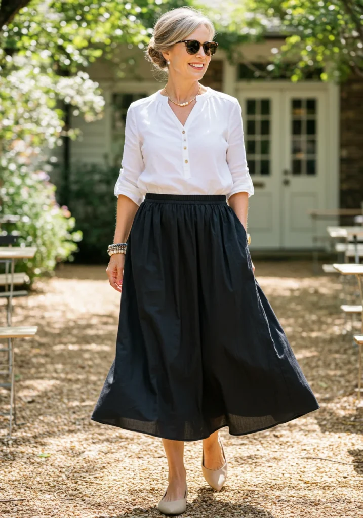 Pairing a simple white blouse with a flowy black maxi skirt offers a relaxed yet elegant look. The soft fabric of the skirt moves gracefully, while the fitted blouse keeps the silhouette balanced. Tan flats add comfort without sacrificing style, perfect for a lunch date or casual gathering.