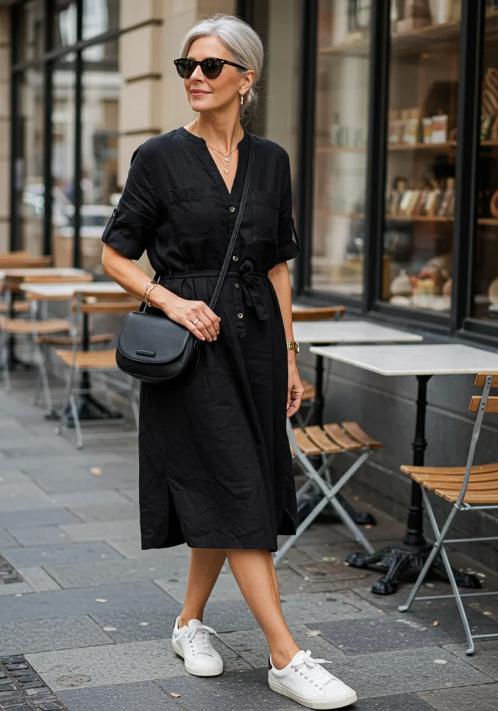 A simple black midi dress is the epitome of effortless elegance. The knee-length cut flatters the legs, while the soft fabric offers comfort. Pair it with white sneakers for a casual vibe and a leather crossbody bag for added style, perfect for brunch or a day out shopping.