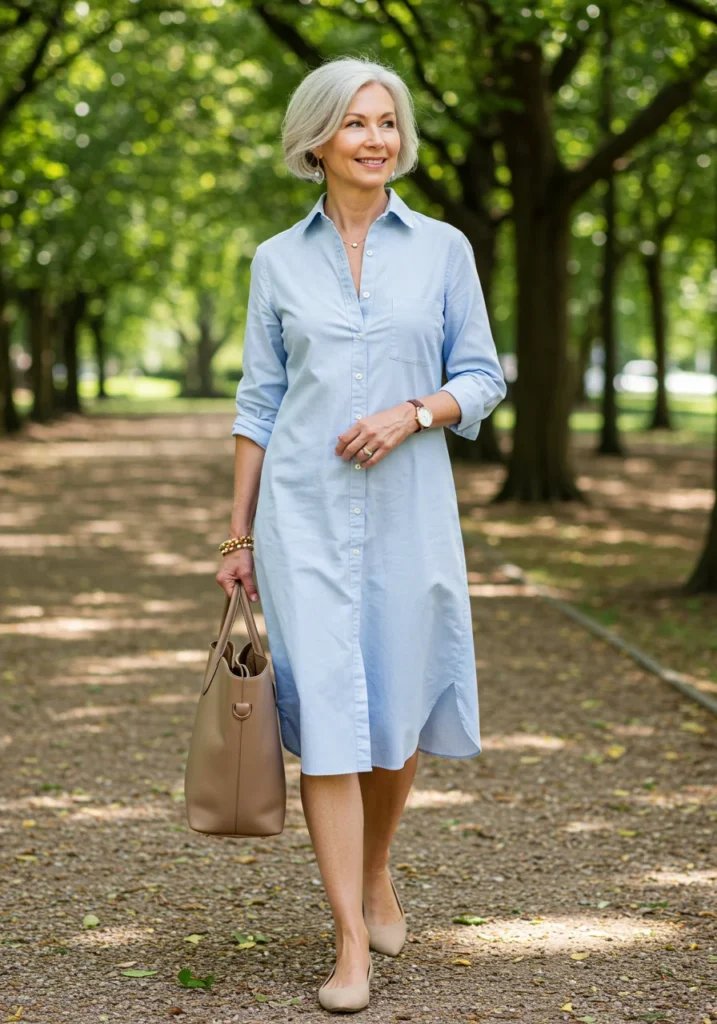 A light blue shirt dress is a timeless, comfortable option for day events. The tailored design flatters the waist and elongates the body, while the lightweight fabric keeps you cool. Beige flats and a leather tote provide a practical yet stylish finish, ideal for casual office days or afternoon events.
