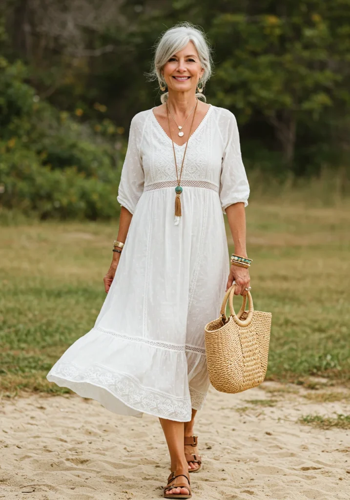 A flowing white boho dress brings relaxed elegance to your summer wardrobe. The loose, airy fabric ensures comfort, while the waist-tie adds shape. Brown sandals and a straw bag enhance the casual, chic vibe, perfect for beach outings or casual garden parties.