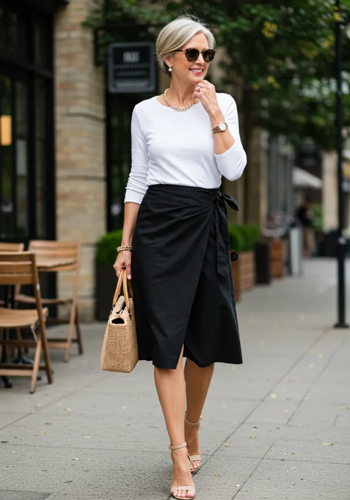 A black wrap skirt paired with a white blouse creates a balanced, flattering silhouette. The wrap skirt hugs the waist while the blouse flows gracefully, providing a slimming effect. Nude sandals complete the look, ideal for casual events or a lunch date.