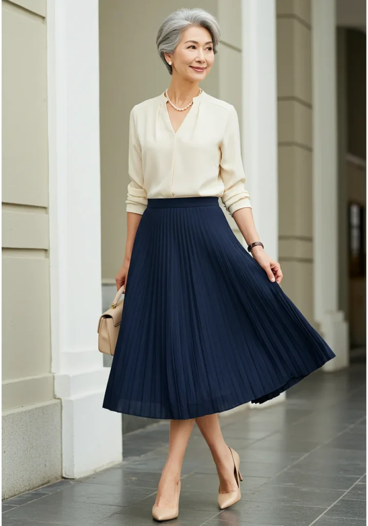 A cream blouse tucked into a navy pleated skirt offers a fresh, elegant look. The pleats add movement to the outfit, while the fitted blouse defines the waist. Beige heels elevate the look, making it suitable for a professional event or a night out.