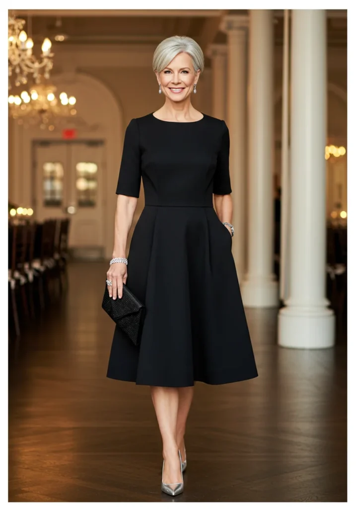The black A-line dress is a wardrobe classic that suits nearly any occasion. The A-line cut creates a balanced silhouette, while the black color is universally flattering. Silver pumps and a black clutch complete the ensemble, making it ideal for both formal and semi-formal events.