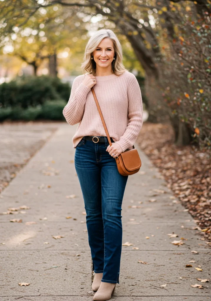 [Shop Now from Amazon: Dark Wash Bootcut Jeans + Blush Knit Sweater + Tan Ankle Boots + Brown Crossbody Bag]
