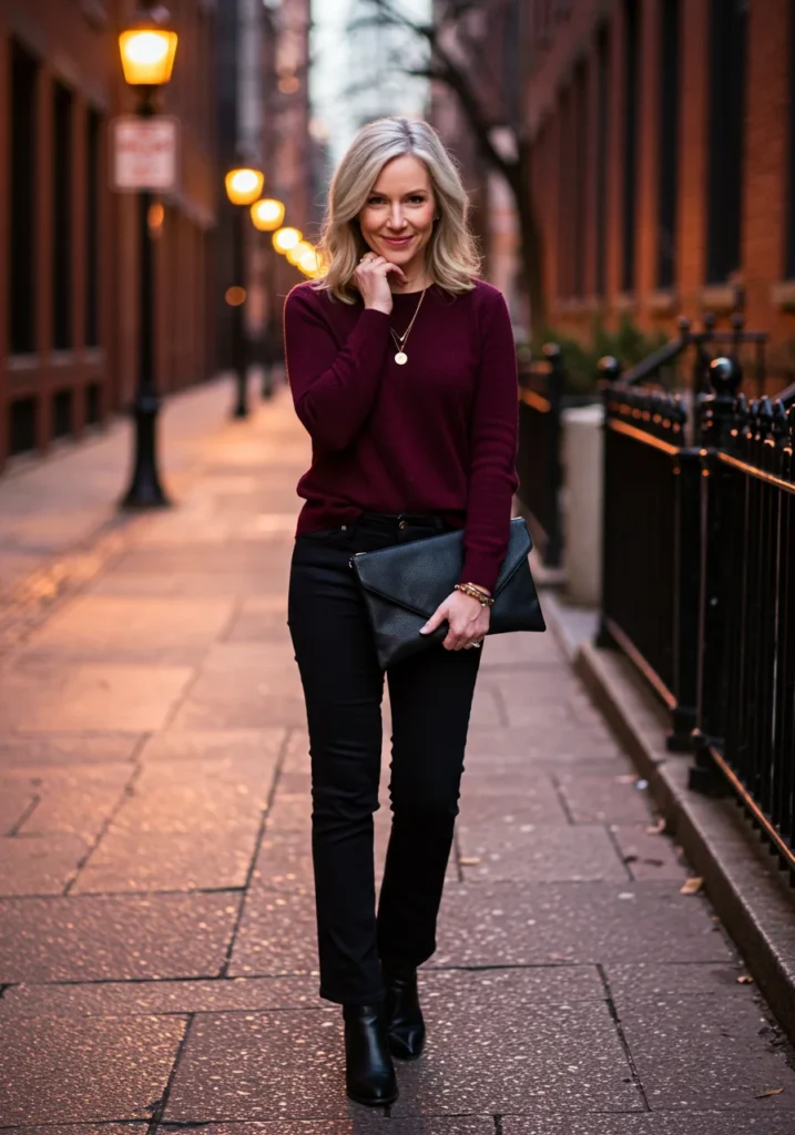I wore this on a chilly evening in Boston. Pinterest highlights “burgundy sweater outfits over 40” as trending, adding warmth and elegance to bootcut jeans.