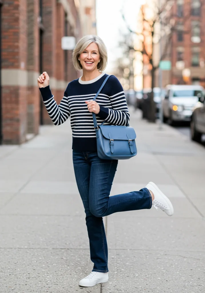 Stripes instantly make outfits fun and polished. Pinterest trends show mature women are increasingly pairing stripes with bootcut jeans for casual outings.