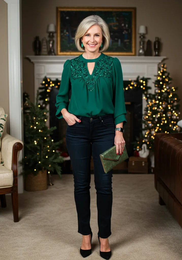 Holiday parties felt effortless with this bold top combo. Google Trends shows rising interest in “statement blouse outfit over 40.”
