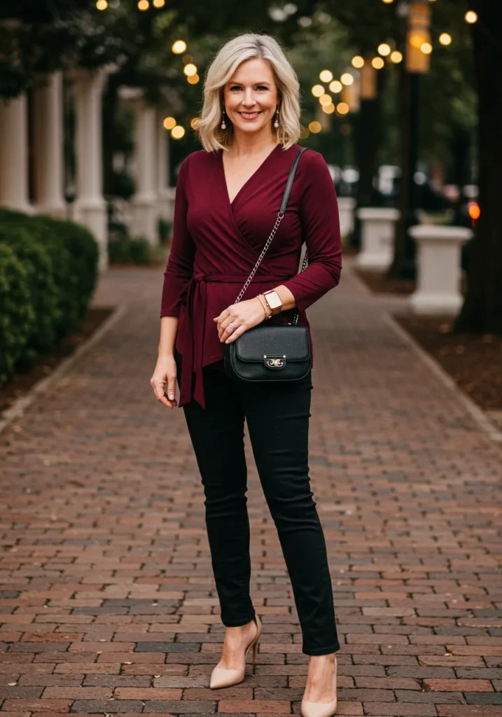 Perfect for date nights, wrap tops paired with bootcut jeans are flattering for all body shapes. Pinterest confirms “wrap tops over 40” are trending.