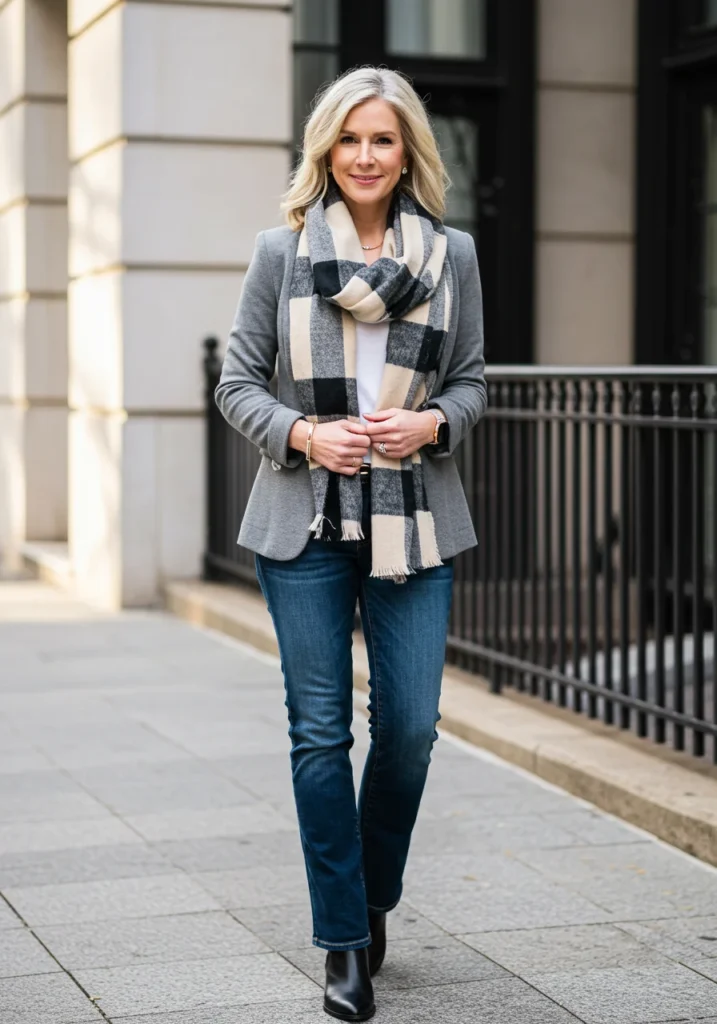 Adding a scarf elevated a simple jeans-and-blazer combo. Pinterest searches show scarves are increasingly paired with bootcut jeans among women 40+.