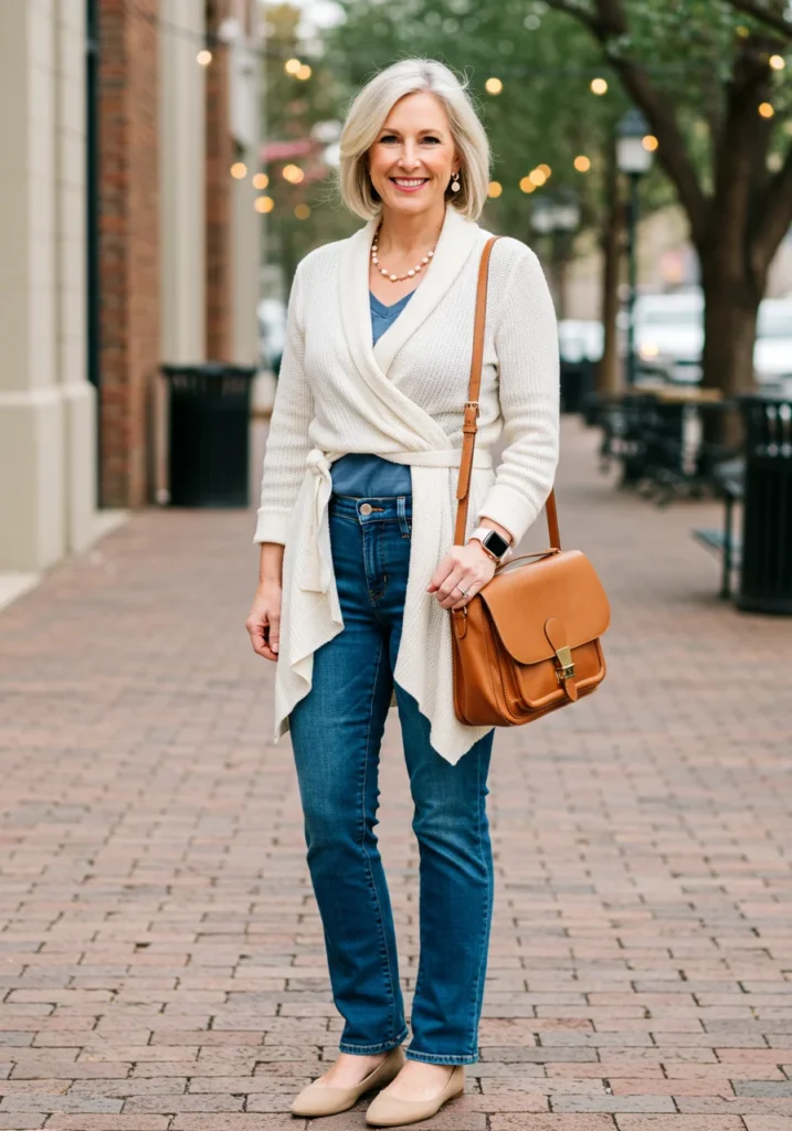 Wrap cardigans add structure and elegance to casual jeans. I wore this for weekend brunch in Dallas—it was both cozy and chic.