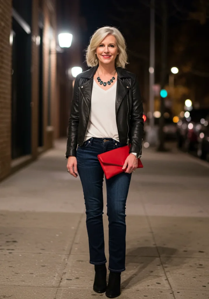 I wore this to a casual night out, and it instantly boosted my confidence. Google Trends shows searches for “bootcut jeans leather jacket outfit” rising, proving edgy styles are timeless for women 40+.