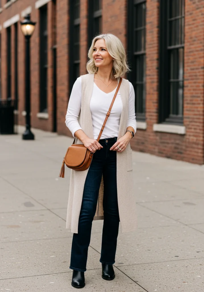 Longline vests instantly elongate the silhouette. Google Trends shows “longline vest outfit over 40” is growing, making it a versatile pairing for bootcut jeans.