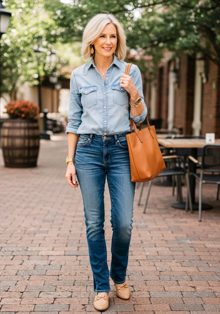 Chambray shirts make bootcut jeans effortlessly chic. During a brunch in Austin, I received compliments all morning. Pinterest indicates “chambray shirt over 40” is a growing style trend.