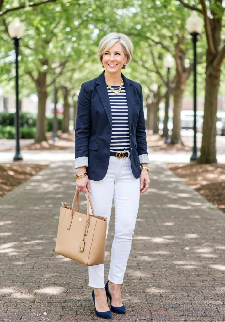 [Shop Now from Amazon: White Bootcut Jeans + Navy Blazer + Striped Tee + Navy Pumps + Tan Tote Bag]