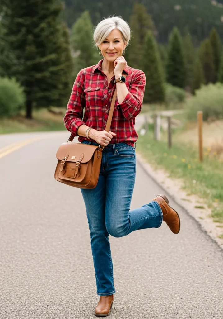 [Shop Now from Amazon: Blue Bootcut Jeans + Red Plaid Shirt + Brown Boots + Tan Satchel Bag]
