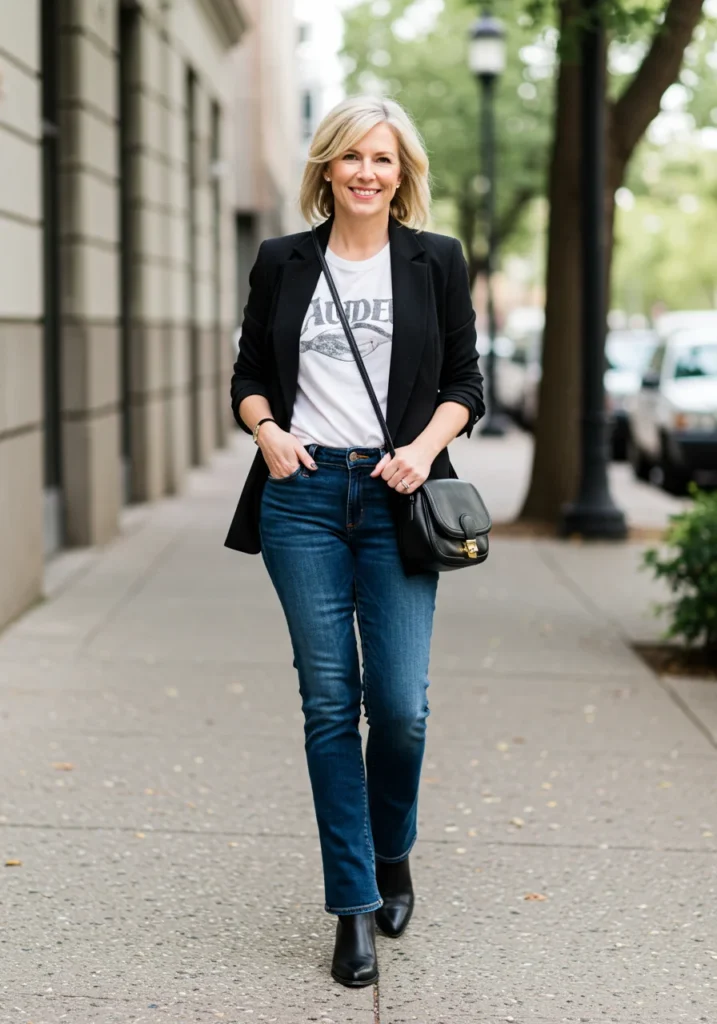9. Dark Wash Bootcut Jeans with Blazer and Graphic Tee