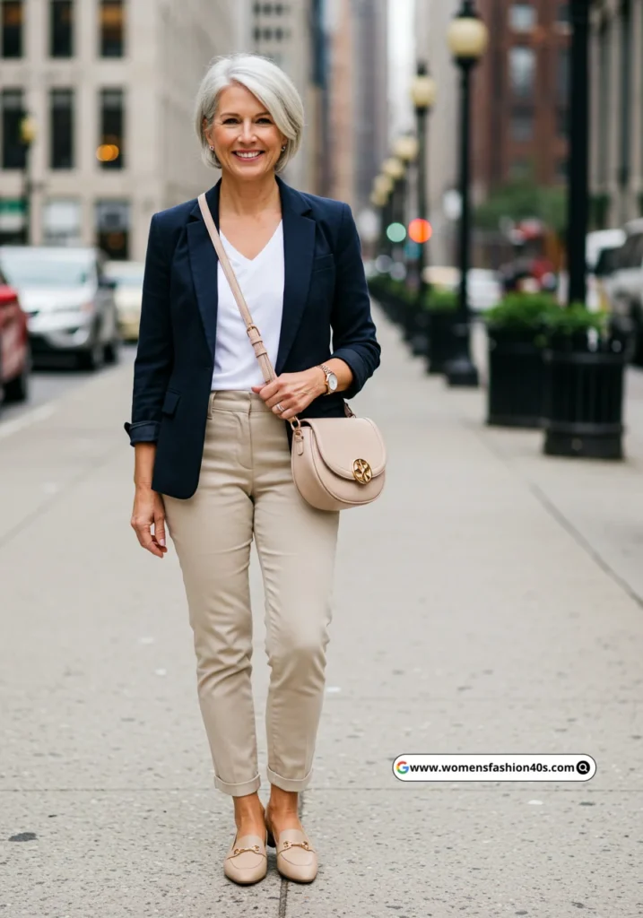 This outfit is perfect for those days when you want to look chic without much effort. The navy blazer adds structure, while the white tee keeps it casual. The beige trousers elongate the legs, and the nude loafers provide comfort without sacrificing style. It’s a go-to look for both work and weekend outings.
