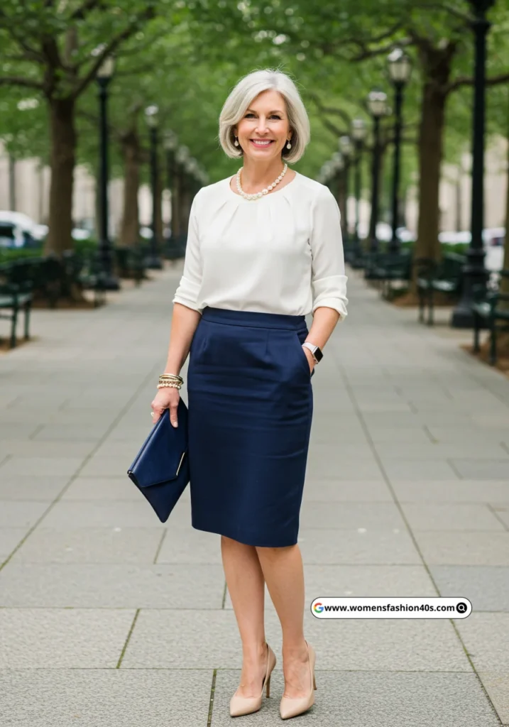 11. White Blouse + Navy Skirt