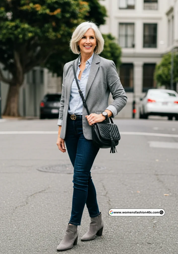 A grey blazer paired with black jeans is a modern twist on a classic look. The grey ankle boots add a touch of edge, and the black crossbody bag keeps it casual yet chic.