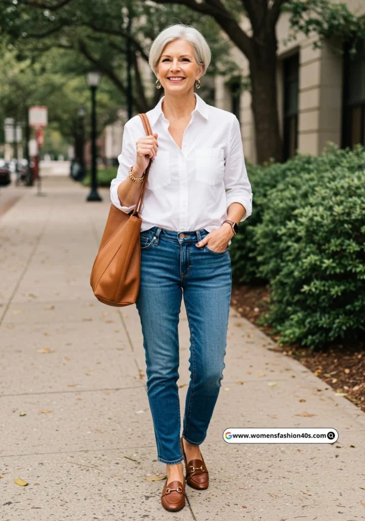 The classic combination of a white button-down shirt and blue jeans is timeless. The brown loafers and tote bag add warmth to the look, making it perfect for everyday wear.