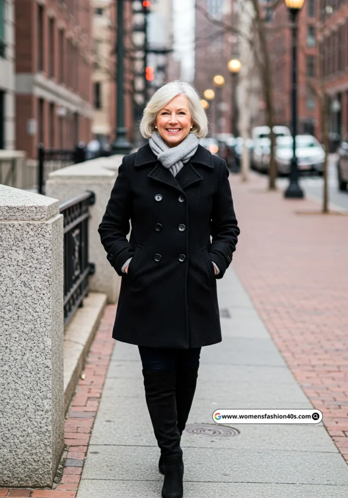 For colder days, a black peacoat paired with a grey scarf is both functional and stylish. The black gloves and boots keep you warm while maintaining the chic aesthetic.