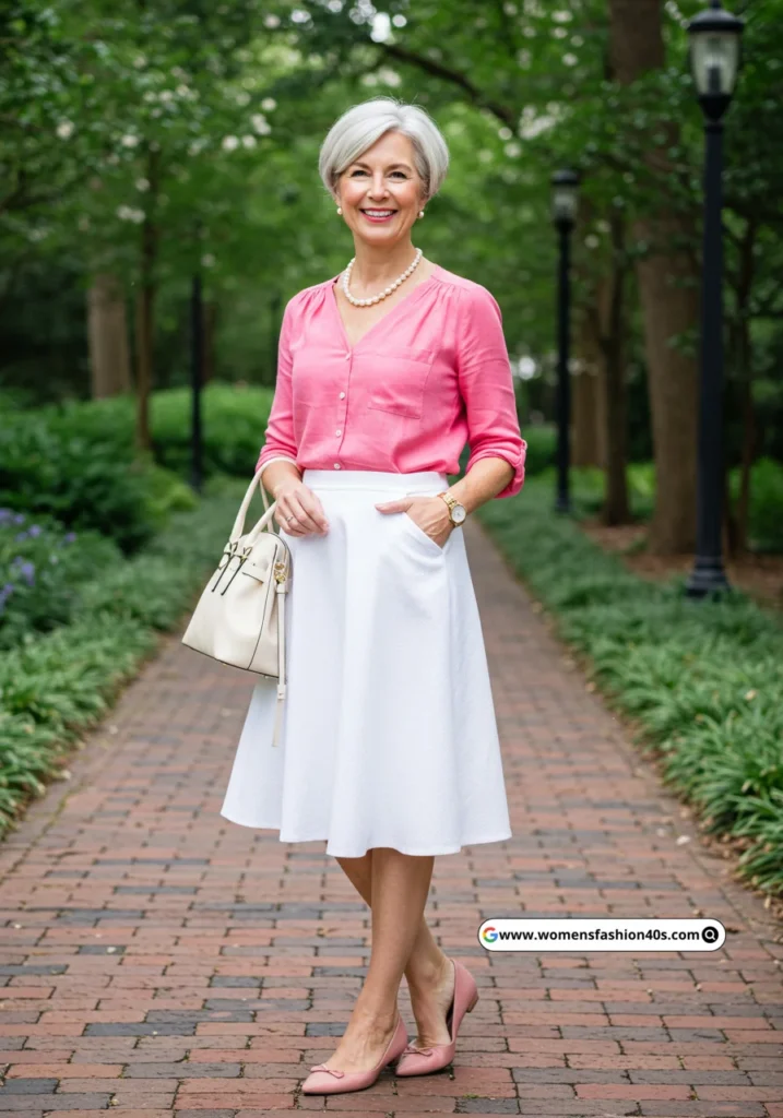 A soft pink blouse paired with a white skirt is feminine and fresh. The pink flats and white handbag tie the look together, making it ideal for spring outings.