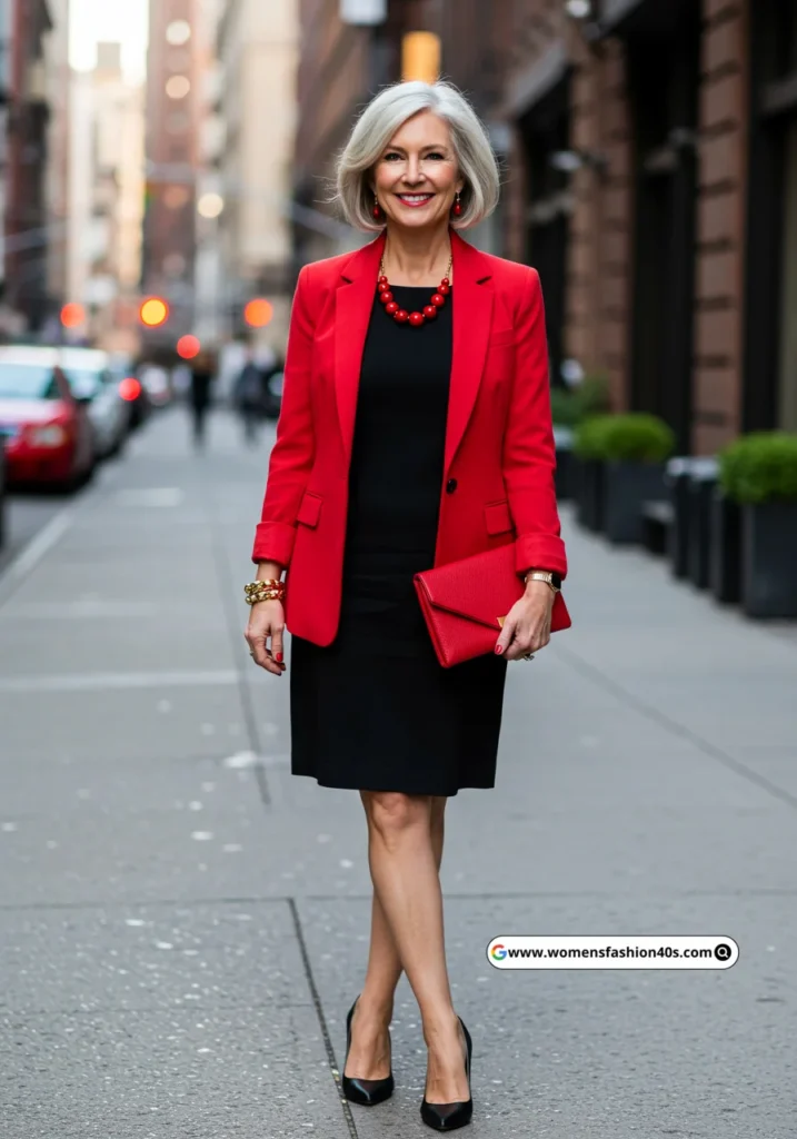 A red blazer over a black dress adds a pop of color. The black heels and red clutch complete the ensemble, making it suitable for evening events or dinner dates.