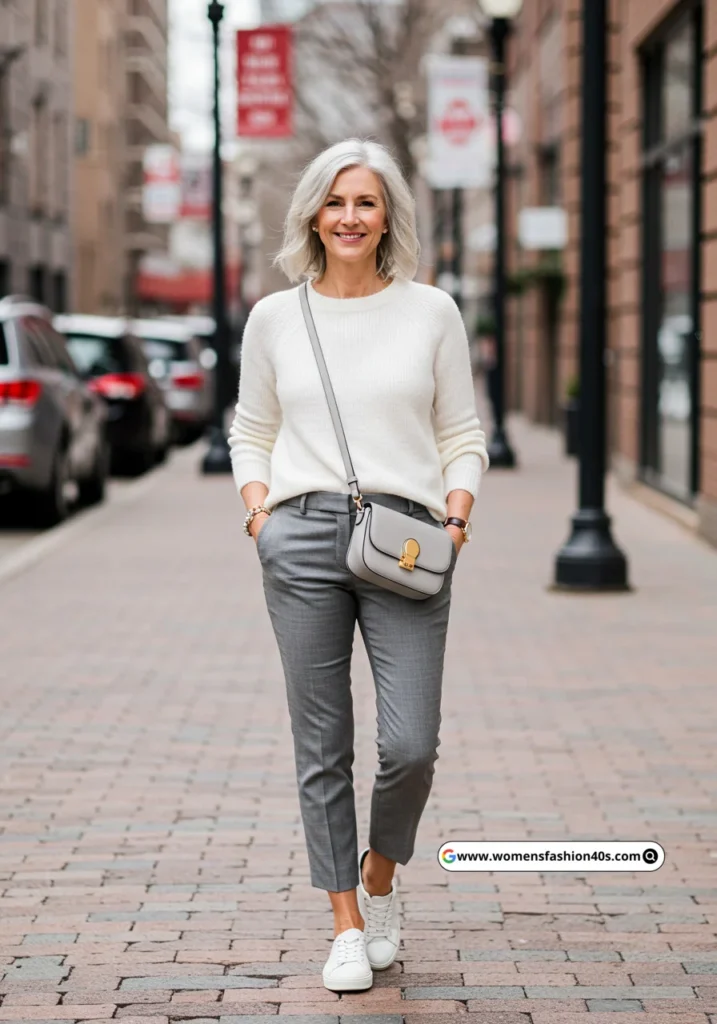 A white sweater paired with grey pants is a clean and modern look. The white sneakers add comfort, and the grey crossbody bag keeps it practical.