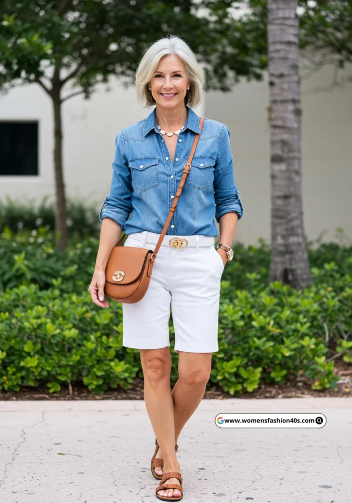 A blue denim shirt paired with white shorts is a casual and comfortable outfit. The brown sandals and crossbody bag add a touch of warmth, making it perfect for summer outings.
