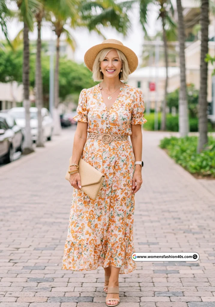 Floral Maxi Dress + Tan Sandals + Straw Hat + Tan Clutch
