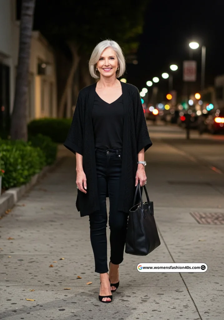 A black kimono cardigan paired with black jeans is a chic and effortless look. The black heels and tote bag complete the ensemble, making it suitable for various occasions.