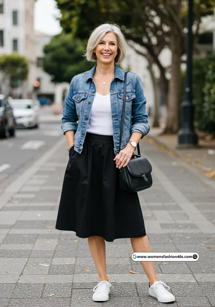 Layering a denim jacket over a white tank adds dimension to a simple outfit. The black skirt balances the look, and the white sneakers keep it casual. This ensemble is perfect for transitional weather and can be dressed up or down with accessories.