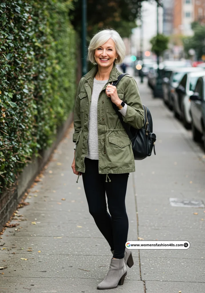 The utility jacket is both practical and stylish. Paired with black leggings and ankle boots, this outfit is ideal for running errands or casual outings. The olive green color adds a pop without being too bold.
