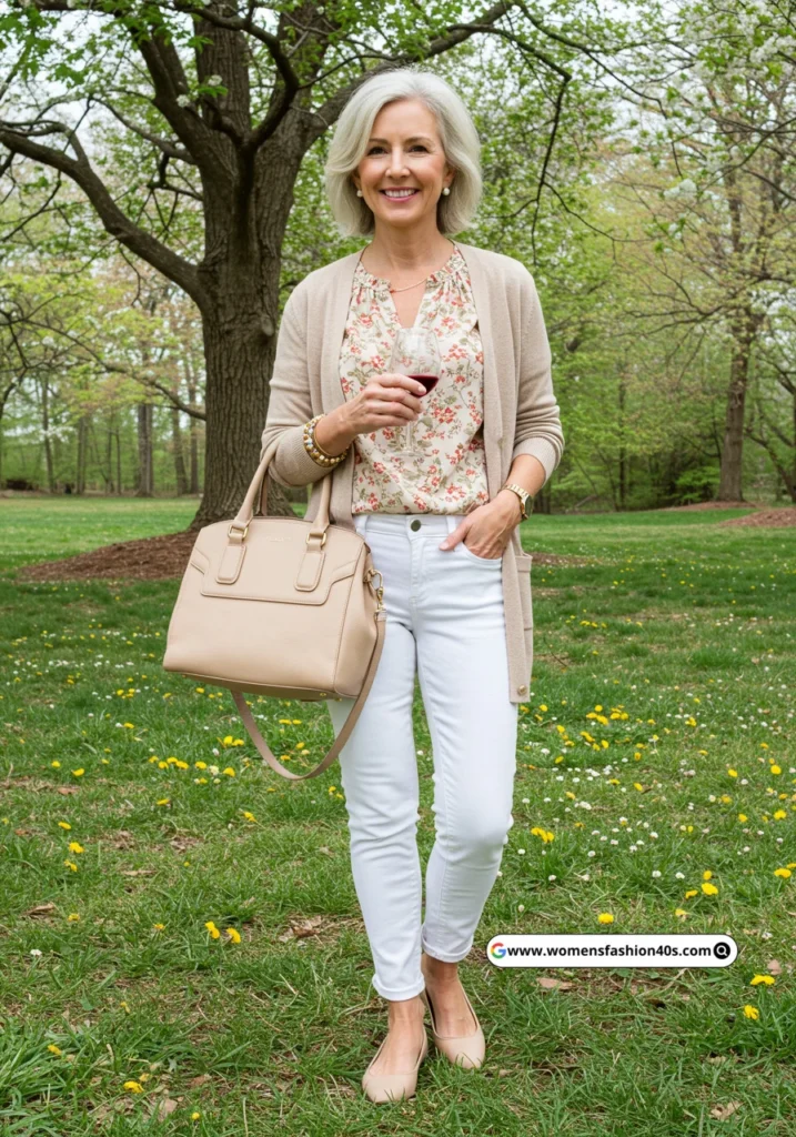 Layering a beige cardigan over a floral blouse adds warmth and texture. The white jeans brighten the look, and the beige accessories tie everything together. This outfit is perfect for spring outings or casual gatherings.