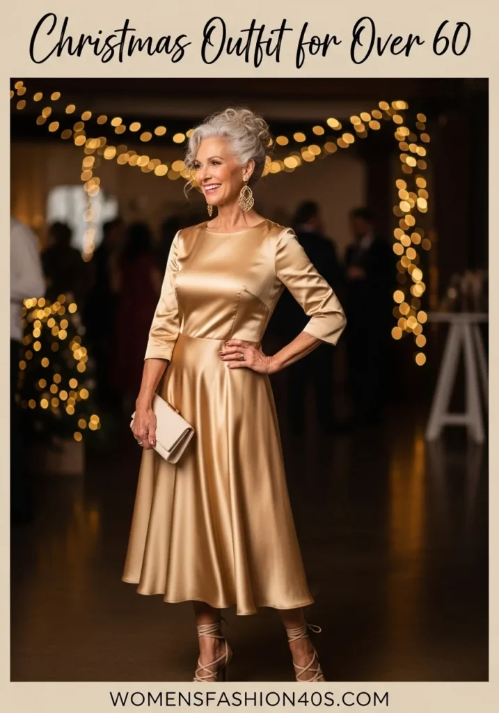 A gold satin dress radiates festive warmth. I wore one to my granddaughter’s Christmas play — it caught every sparkle of light. According to Google Trends, “satin dresses for Christmas” are surging in popularity among mature shoppers.