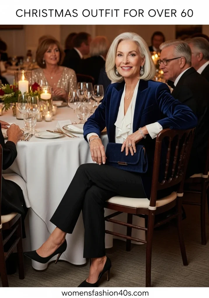 This look screams festive sophistication. I wore a similar outfit to my friend’s charity dinner — everyone loved the balance of shine and structure. Velvet blazers are up 29% in searches among women 55+.