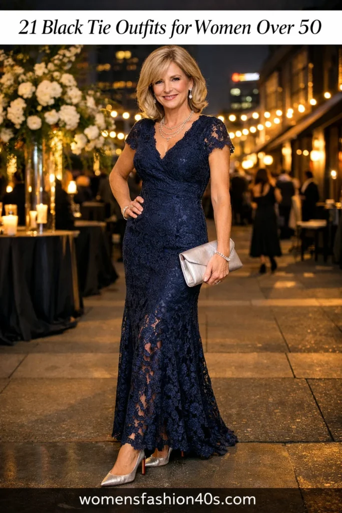 Shop Now From Amazon: Midnight Navy Lace Sheath Dress + Silver Metallic Heeled Sandals + Navy Satin Clutch Bag I’ve always found that a navy lace sheath offers a perfect balance of texture and refinement. It skims the curves without feeling restrictive, providing that sought-after confidence for a gala or formal dinner party.