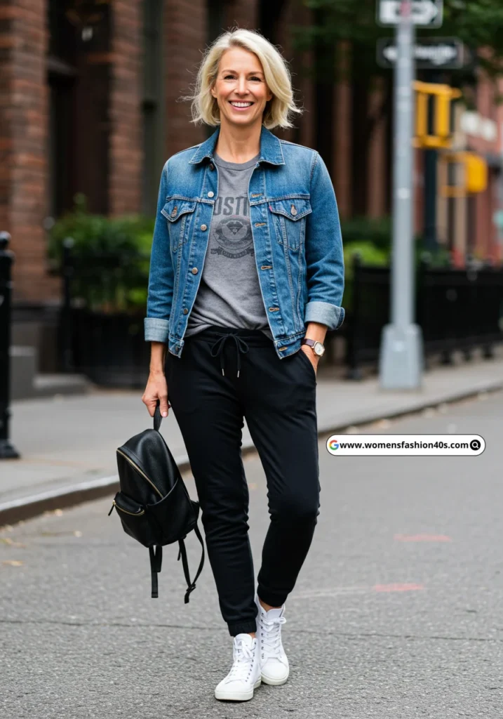 The faded blue denim jacket offers a relaxed vibe. I layered it over a grey graphic tee and paired it with black joggers for a comfortable outfit. The white high-top sneakers and black backpack completed the look, perfect for a casual day with friends.