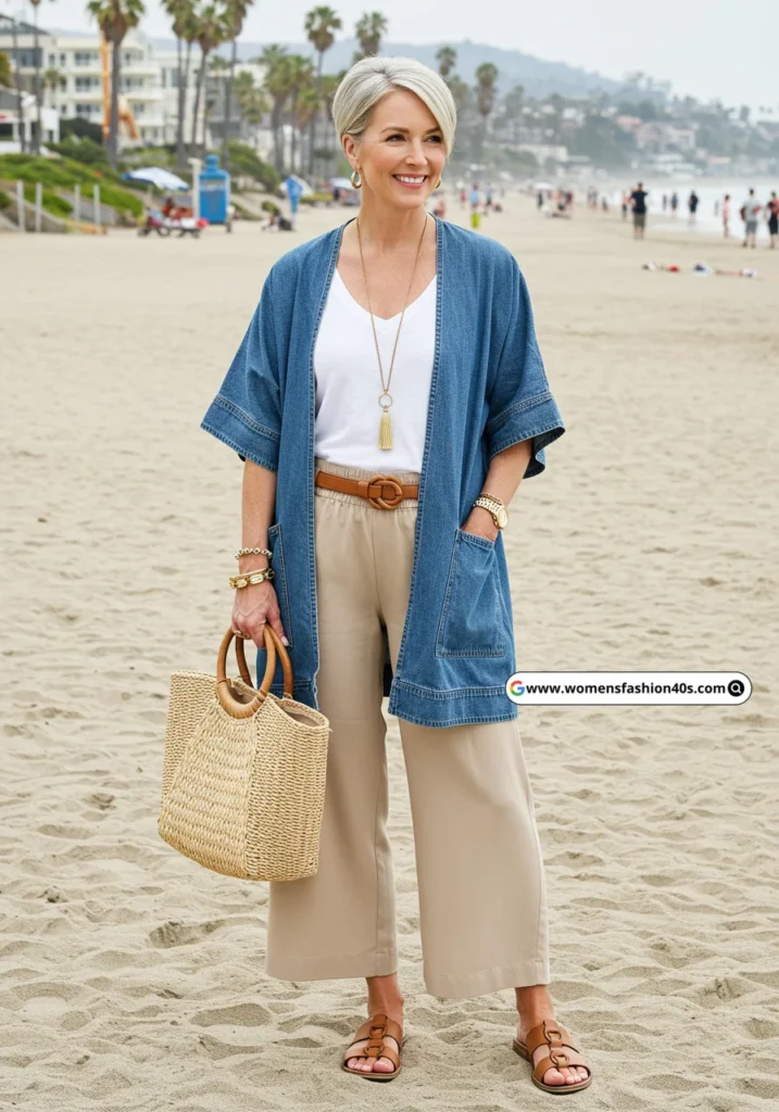 The denim kimono jacket adds a bohemian touch to any outfit. I wore it over a white tank top and paired it with beige palazzo pants for a beach day. The brown sandals and straw tote bag kept the look coordinated and practical, making it perfect for summer outings.