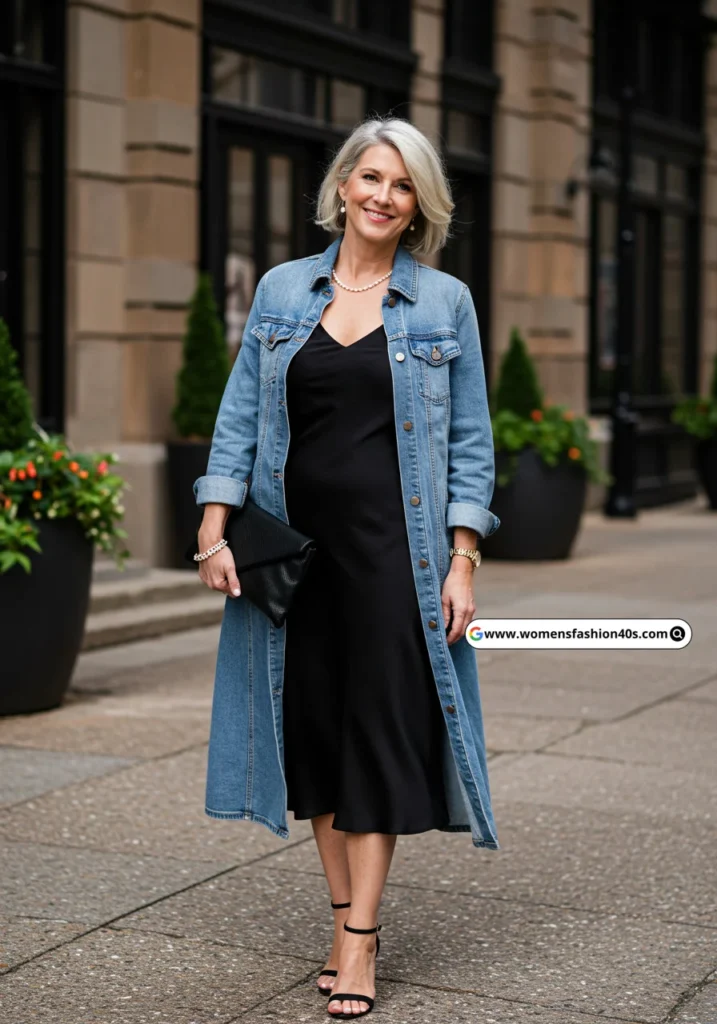 The denim duster jacket adds a dramatic flair to any outfit. I layered it over a black slip dress for an evening event. The black heeled sandals and clutch bag completed the look, making it both elegant and stylish.