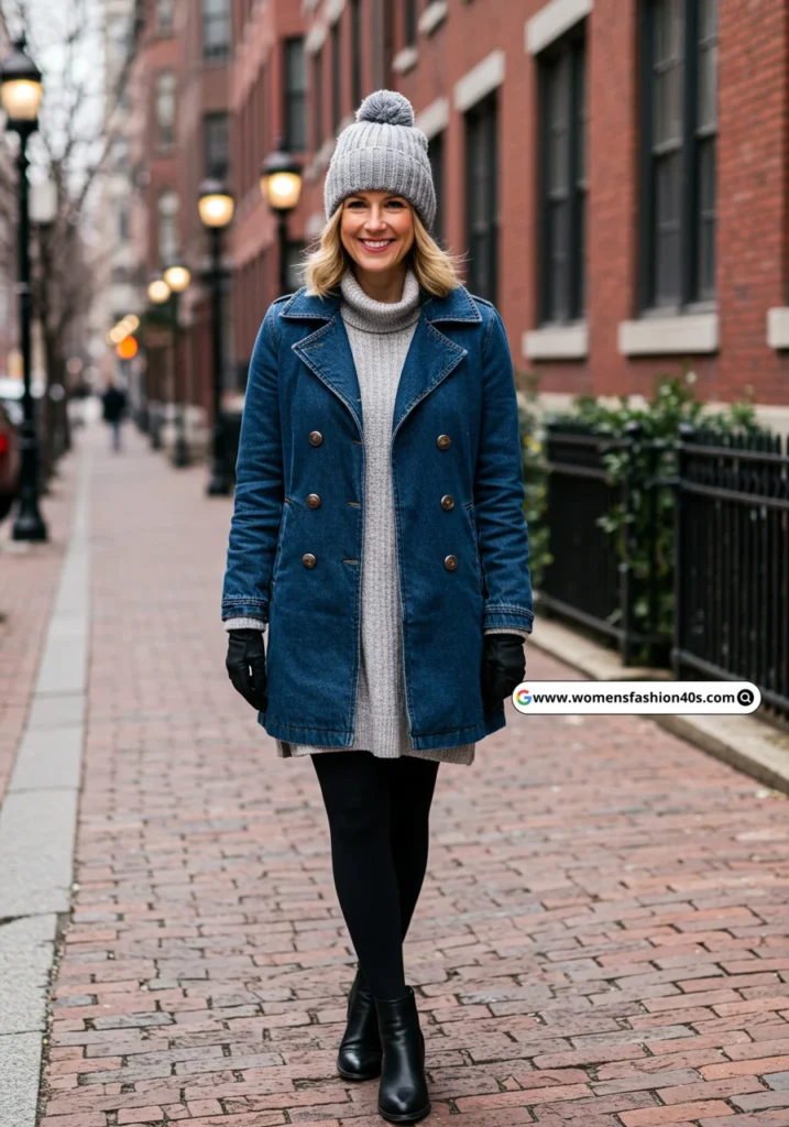 The denim peacoat offers a cozy yet stylish option for cooler weather. I wore it over a grey sweater dress and paired it with black leggings for a winter outing. The black ankle boots and grey beanie kept the look coordinated and practical.