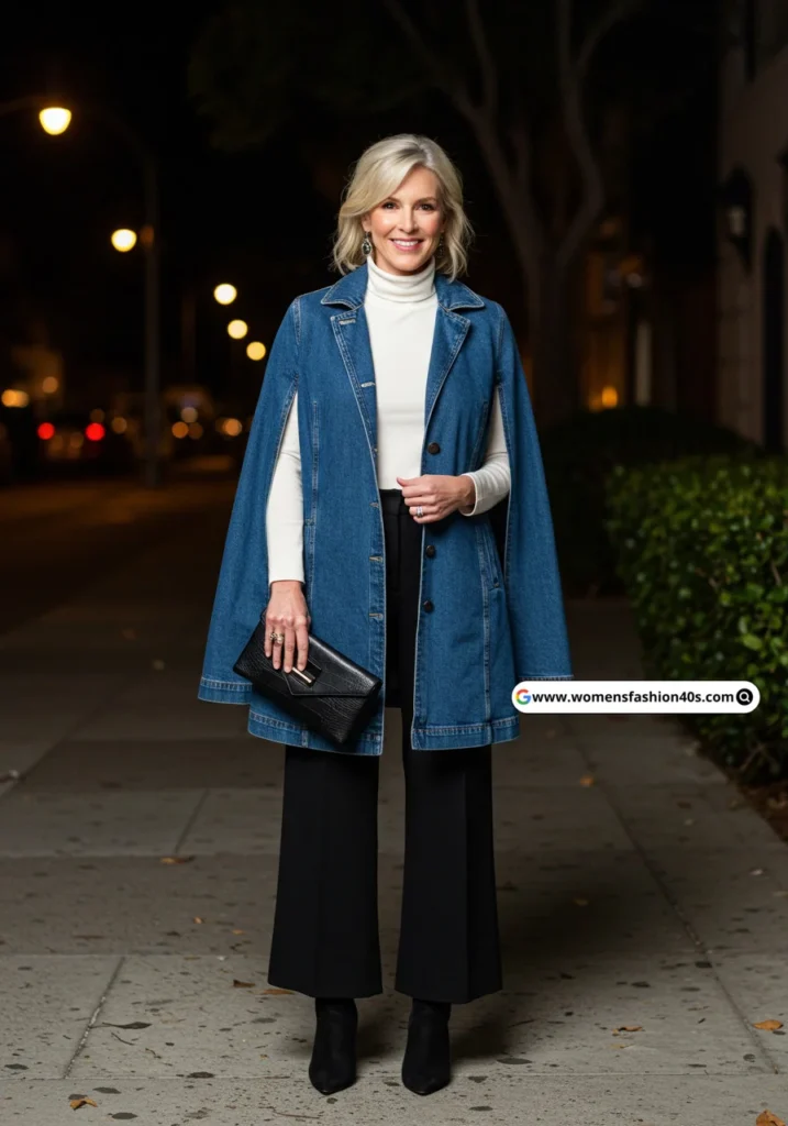 The denim cape coat adds a dramatic silhouette to any outfit. I layered it over a white turtleneck and paired it with black wide-leg pants for a chic look. The black heeled boots and clutch bag completed the ensemble, making it perfect for evening events.