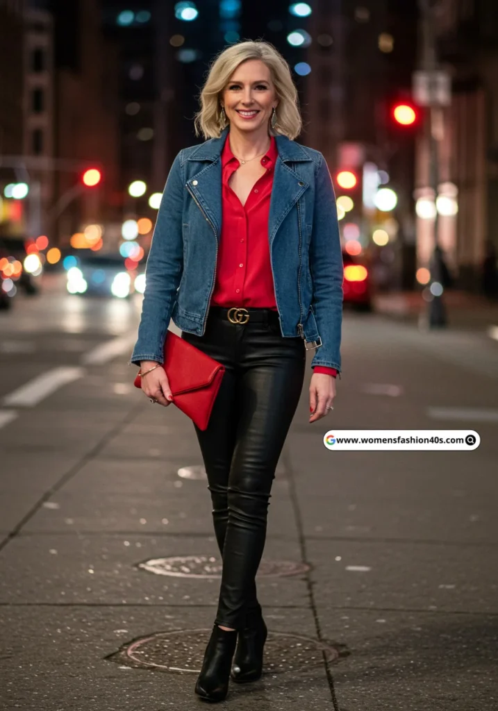 For a bold statement, the black denim moto jacket is a must-have. I paired it with a red silk blouse and black leather pants for a night out. The black heeled booties added height, while the red clutch bag added a pop of color, making it a standout ensemble.