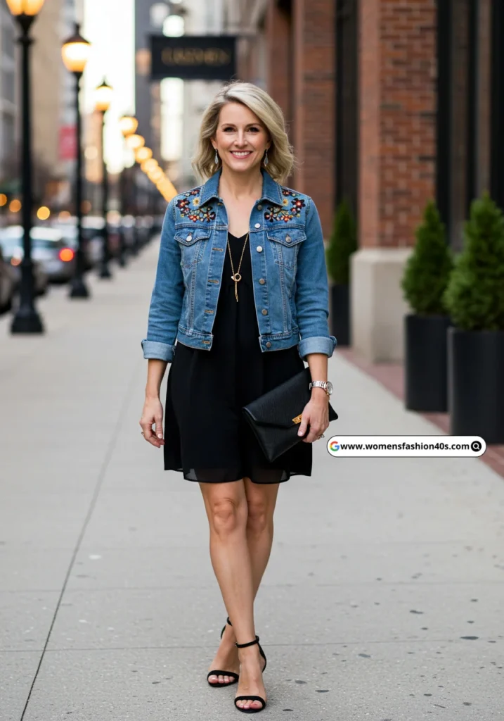 The cropped denim jacket with embroidery adds a unique flair to any outfit. I layered it over a black shift dress for an evening out. The black ankle strap heels and clutch bag kept the look elegant, making it perfect for dinner dates or evening events.