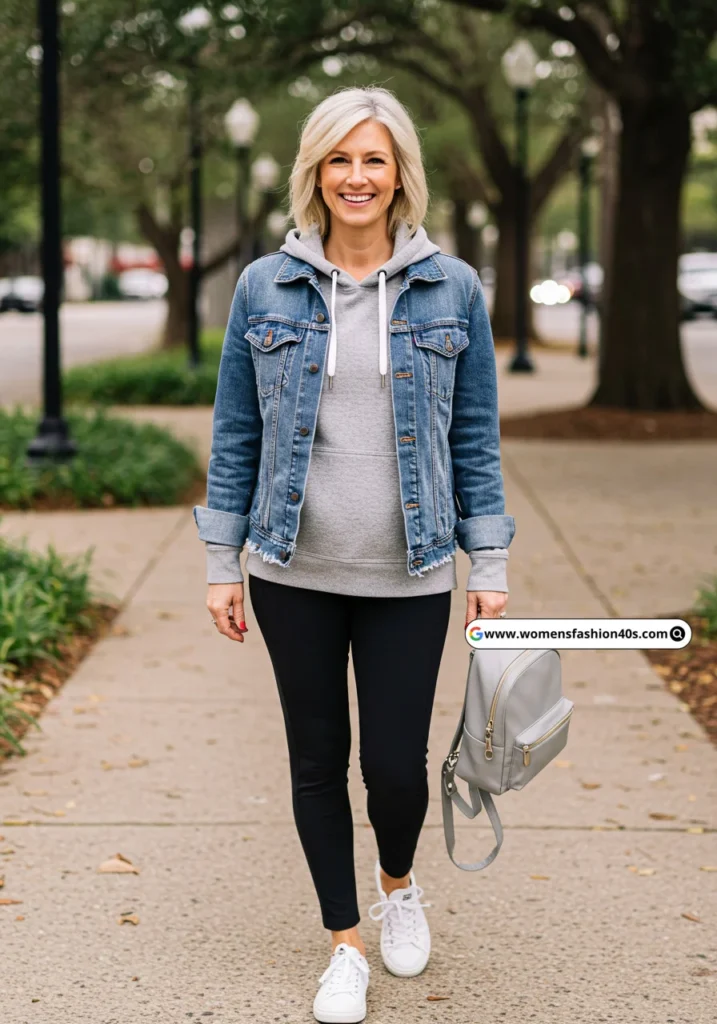 For a laid-back, athleisure-inspired look, the raw hem denim jacket is ideal. I threw it over a grey hoodie and paired it with black leggings for a comfortable yet stylish outfit. The white sneakers and grey backpack completed the ensemble, perfect for running errands or a casual day out.
