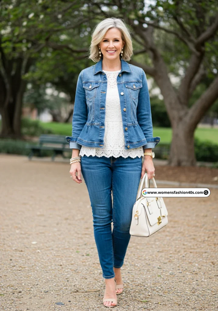 The peplum denim jacket adds a feminine silhouette to any outfit. I wore it over a white lace top and blue skinny jeans for a day at the park. The beige sandals and white handbag kept the look light and airy, making it a great choice for spring outings.