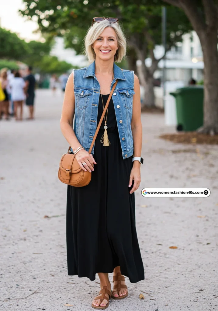 The denim vest offers a layered look without the bulk of a full jacket. I paired it with a black maxi dress and brown gladiator sandals for a summer festival. The tan crossbody bag kept the look coordinated and practical, making it both stylish and functional.