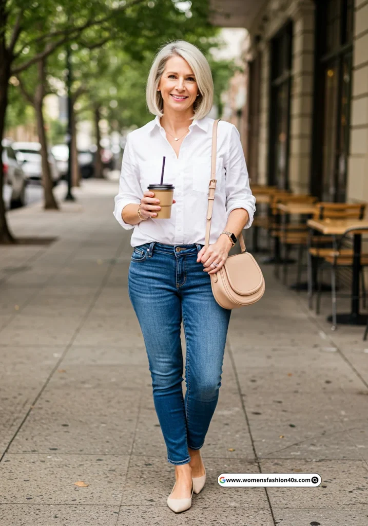 1. White Button-Up Shirt with Blue Skinny Jeans